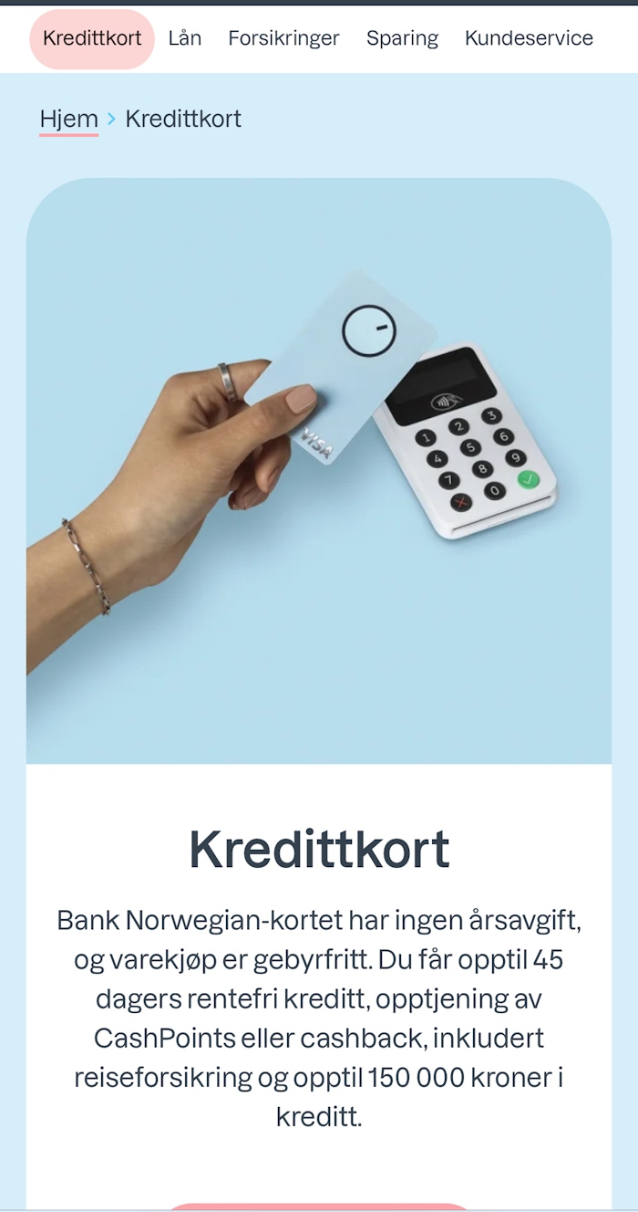 Hos Bank Norwegian var all nøkkelinformasjon om kredittkortet svært enkel å finne. Allerede på forsiden fremgår det hvilke produkter banken tilbyr, og under menyvalget «kredittkort» ligger alle detaljer samlet på én side. Allerede i første avsnitt får man svar på sentrale spørsmål som hva kortet koster, hvor mange rentefrie dager som tilbys og hva som er maksimal kreditt.