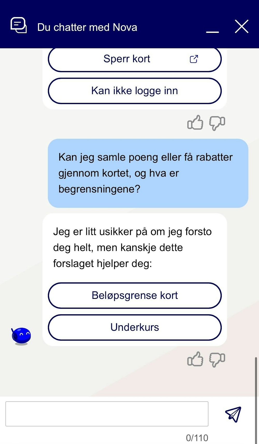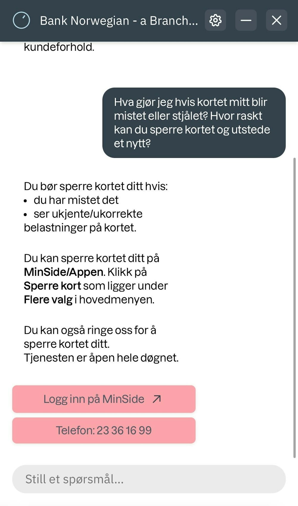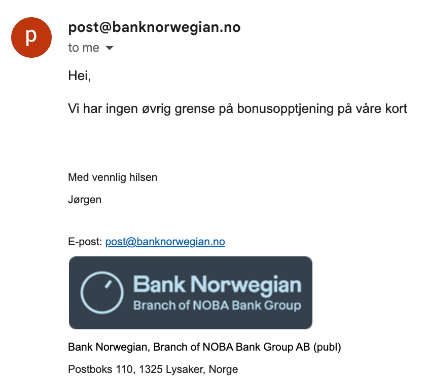 Svarene vi fikk var heller ikke optimalt. Det var enkelt å få svar på hvordan man sperrer kortet, men det var vage svar på om det var noen begrensninger til bonuspoengene.