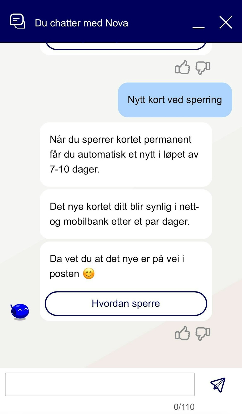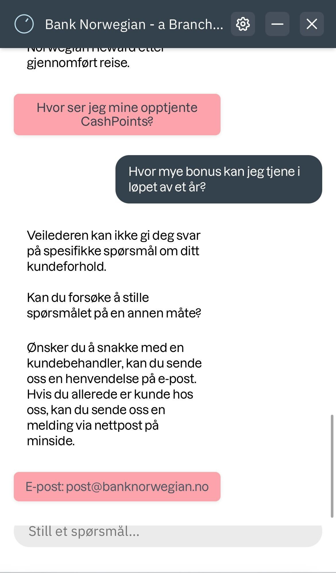 For å teste chatboten, testet vi flere ulike spørsmål. Vi fikk svar på flere av dem, men ikke på hvor lang tid det tar å få et nytt kort eller om det var noen begrensninger på bonusopptjeningen på kredittkortet Bank Norwegian. Deretter sendte vi dem en mail, som ga oss svaret på det vi lurte på bare fem timer senere.