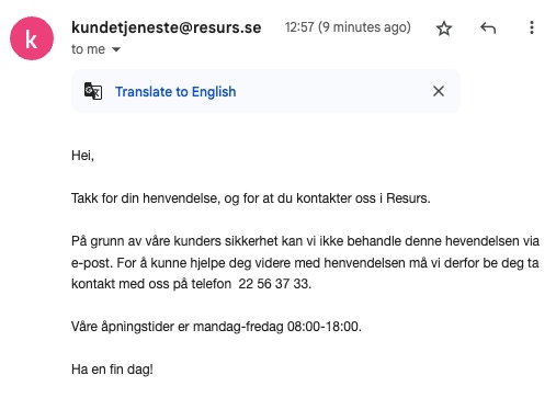 Resurs Bank | Hverdager 08:00-18:00 | Chatbot, nettbank, e-post og telefon | Kun norsk | 🌕🌕🌗🌑🌑 |